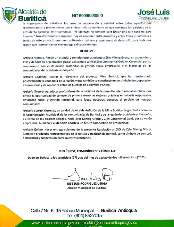 La resolución inicia con una alta valoración sobre la importancia del proyecto minero de Buriticá, calificándolo como “el proyecto aurífero más importante de Colombia”, y destaca de manera especial el firme compromiso demostrado por Zijin Mining a través de su filial Continental Gold.