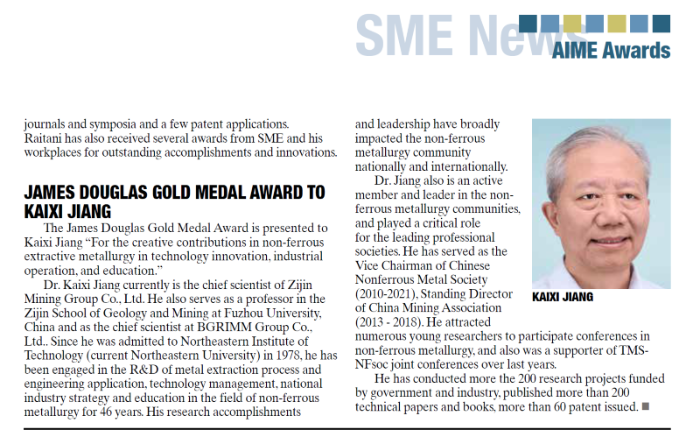 El Dr. Kaixi Jiang, científico jefe de Zijin Mining, una de las principales mineras globales de metales, ha sido nombrado recientemente laureado 2026 de la Medalla de Oro James Douglas por el American Institute of Mining, Metallurgical, and Petroleum Engineers (AIME). Como el primer académico de China en recibir esta distinción, el Dr. Jiang fue reconocido por sus aportes creativos a la innovación tecnológica, las operaciones industriales y la educación en la metalurgia extractiva de metales no ferrosos.